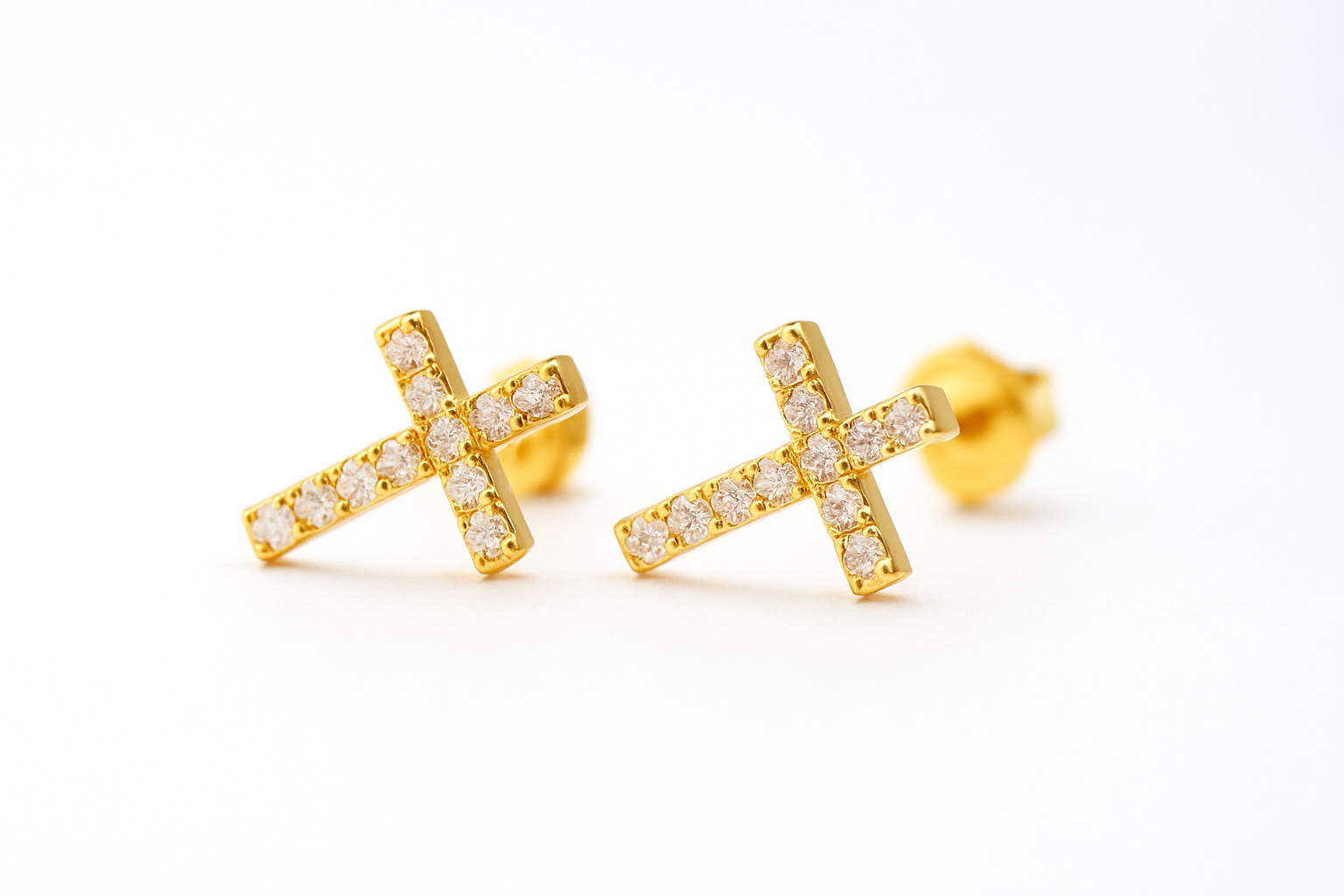 Elevate your elegance with these Petite Natural Lab Diamond Cross Ear Studs, crafted in premium 18K and 14K gold. Featuring delicately set lab-grown diamonds, each stud offers brilliant sparkle with ethical sourcing. The refined cross design brings a subtle yet sophisticated statement, perfect for both everyday wear and special occasions. Lightweight and durable, these earrings combine expert craftsmanship with timeless style.
